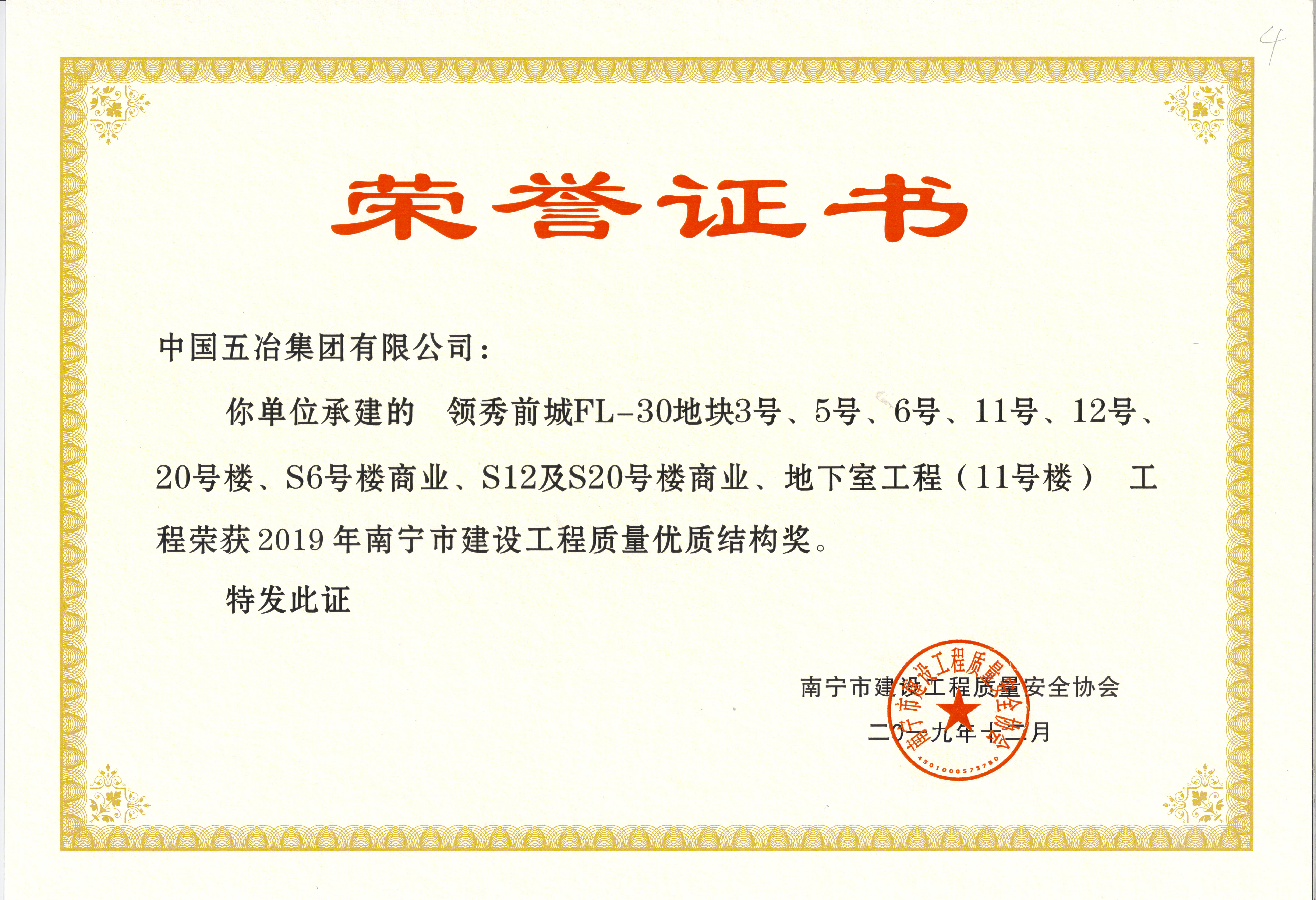 領(lǐng)秀前城FL-30地塊工程—2019年南寧市建設(shè)工程質(zhì)量?jī)?yōu)質(zhì)結(jié)構(gòu)獎(jiǎng)