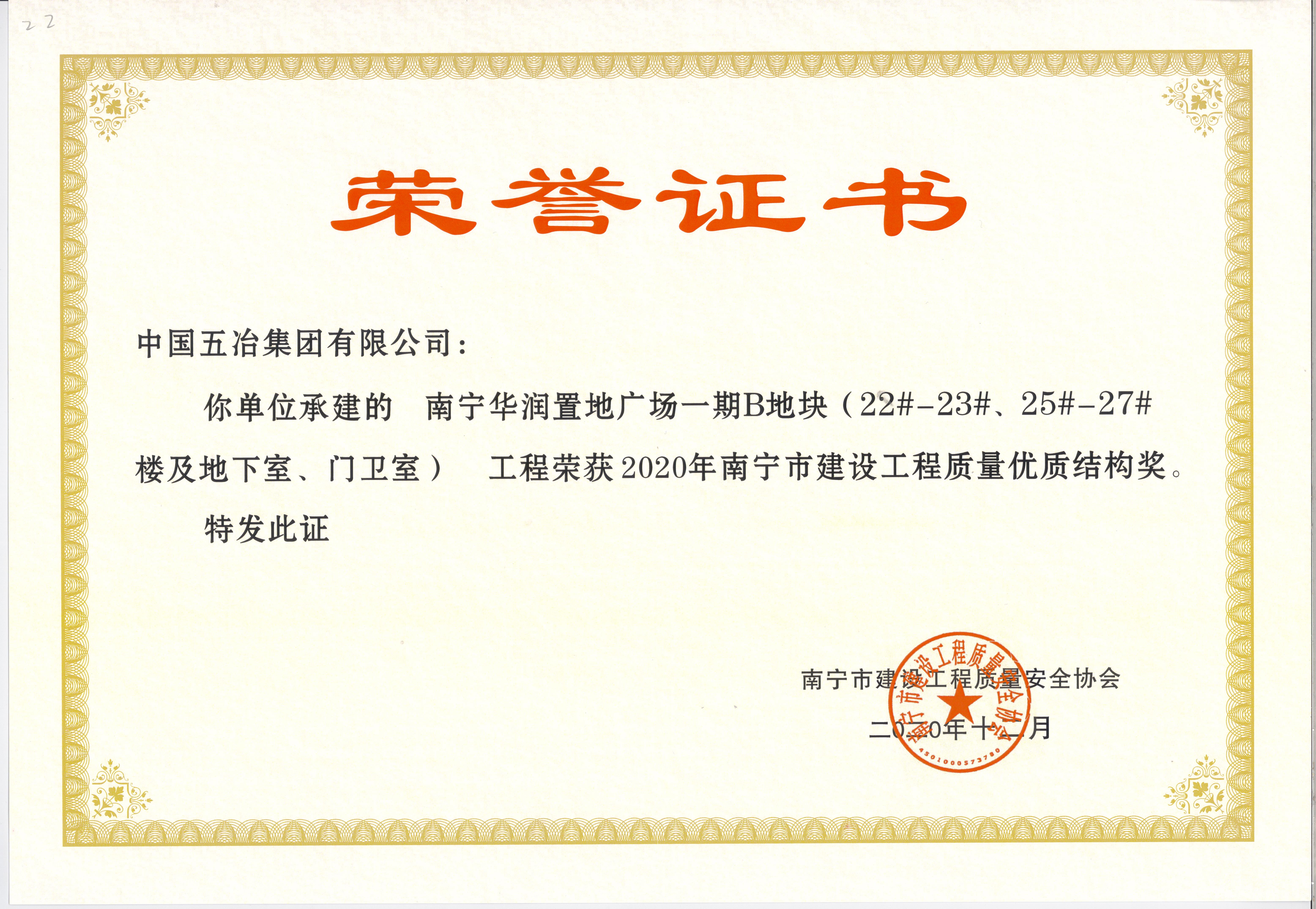 南寧華潤(rùn)置地廣場(chǎng)一期B地塊—2020年南寧市建設(shè)工程質(zhì)量?jī)?yōu)質(zhì)結(jié)構(gòu)獎(jiǎng)