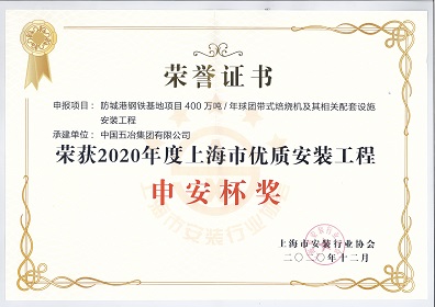 防城港鋼鐵基地項(xiàng)目400萬(wàn)噸/年球團(tuán)帶式焙燒機(jī)及其相關(guān)配套設(shè)施安裝工程-2020年度上海市優(yōu)質(zhì)安裝工程申安杯獎(jiǎng)