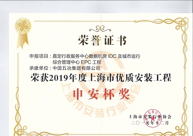 嘉定行政服務(wù)中心數(shù)據(jù)機(jī)房IDC及城市運(yùn)行綜合管理中心EPC工程-2019年度上海市優(yōu)質(zhì)安裝工程申安杯獎(jiǎng)