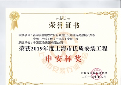 首鋼京唐鋼鐵聯(lián)合有限責(zé)任公司鍍鋅高強(qiáng)度汽車(chē)板專用生產(chǎn)線工程(一標(biāo)段)安裝工程-2019年度上海市優(yōu)質(zhì)安裝工程申安杯獎(jiǎng)