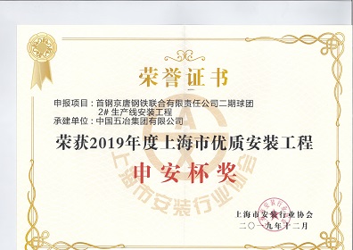 首鋼京唐鋼鐵聯(lián)合有限責(zé)任公司二期球團(tuán)2#生產(chǎn)線安裝工程-2019年度上海市優(yōu)質(zhì)安裝工程申安杯獎(jiǎng)