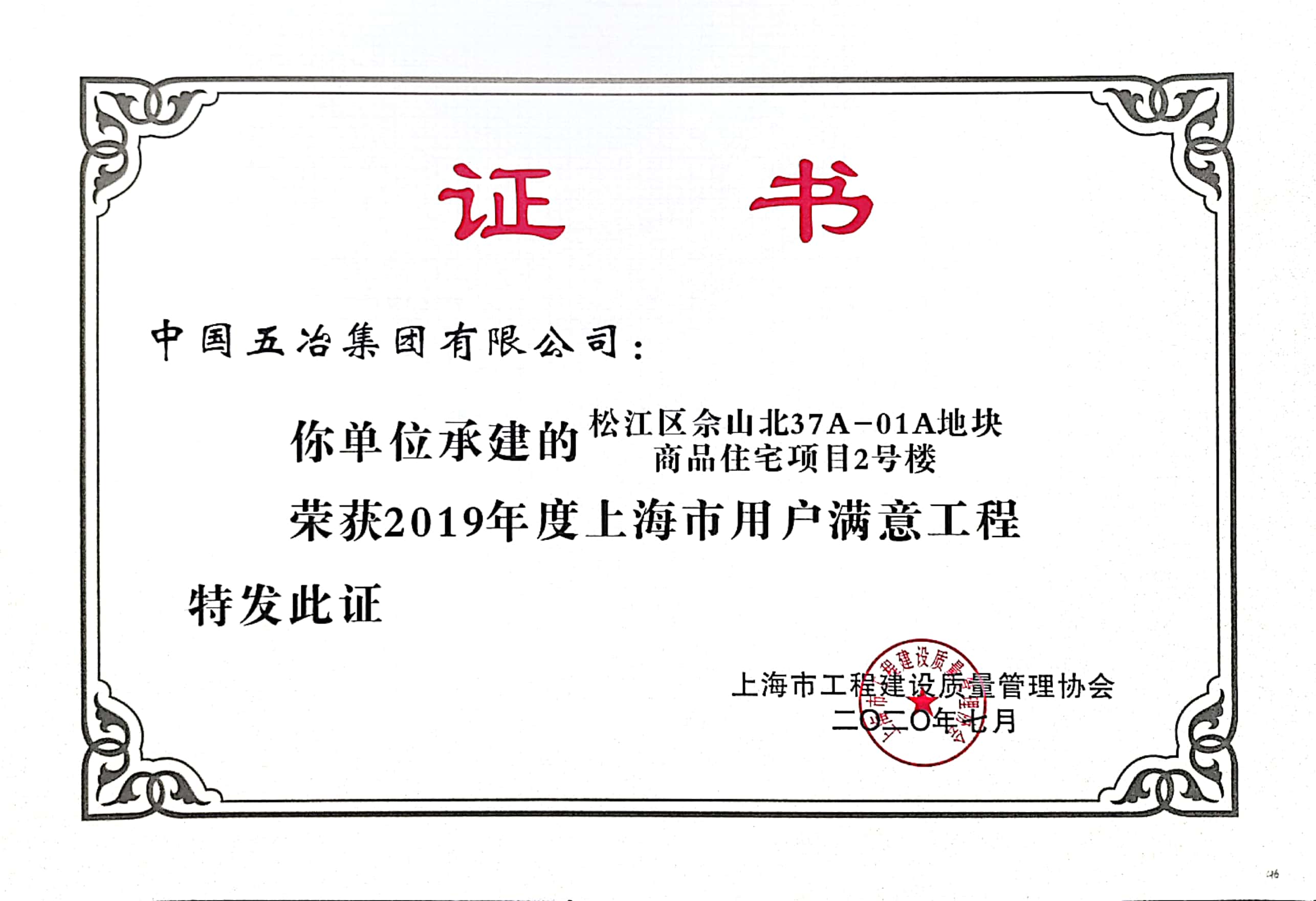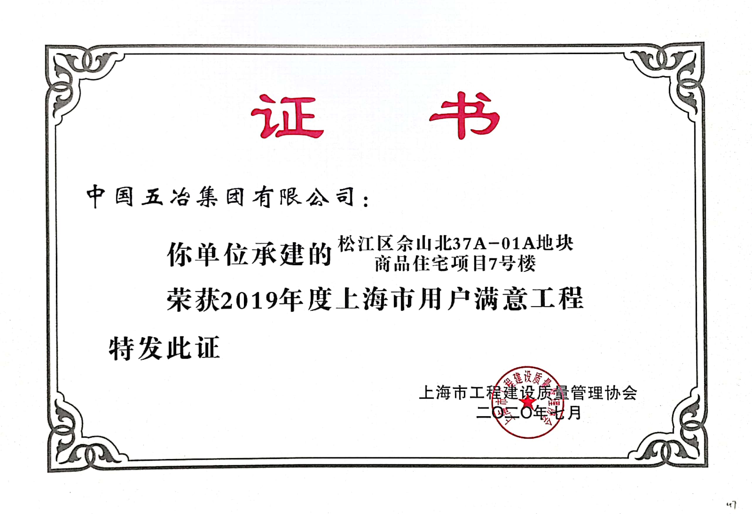 松江區(qū)佘山北37A-01A地塊商品住宅項目7號樓榮獲2019年度上海市用戶滿意工程