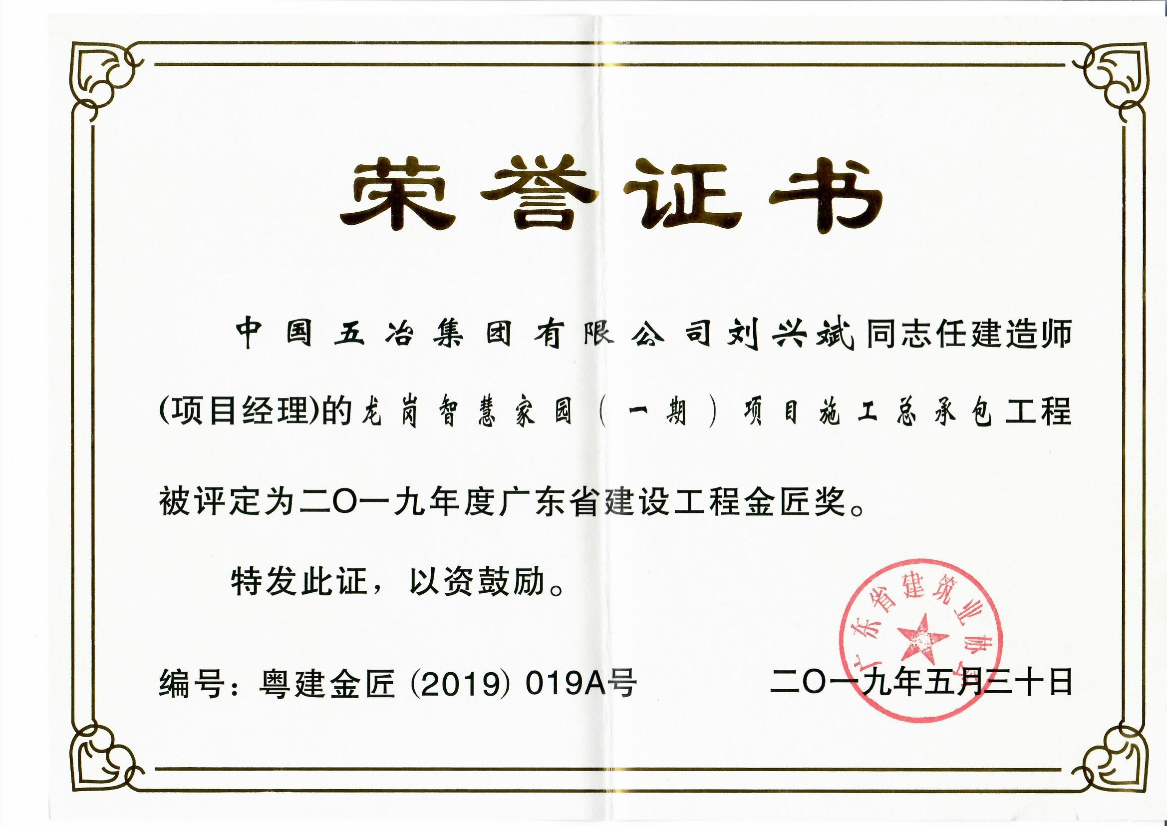 龍崗智慧家園(一期)項目施工總承包工程被評定為二〇一九年度廣東省建設(shè)工程金匠獎