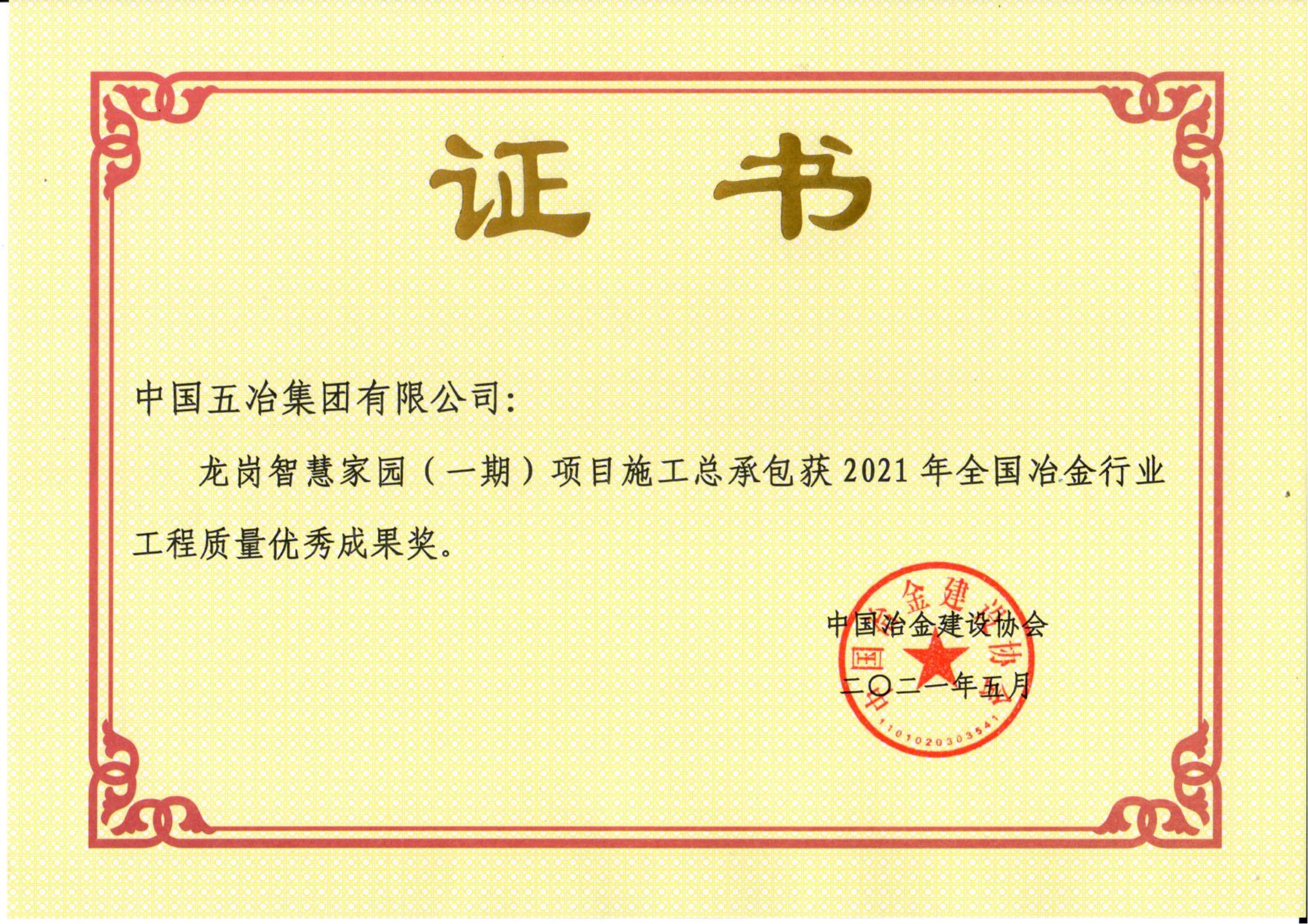 龍崗智慧家園(一期)項目施工總承包獲2021年全國冶金行業(yè)工程質(zhì)量優(yōu)秀成果獎