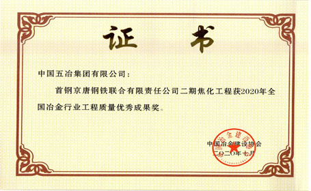 首鋼京唐鋼鐵聯(lián)合有限責(zé)任公司二期焦化工程——2020年全國冶金行業(yè)工程質(zhì)量優(yōu)秀成果獎