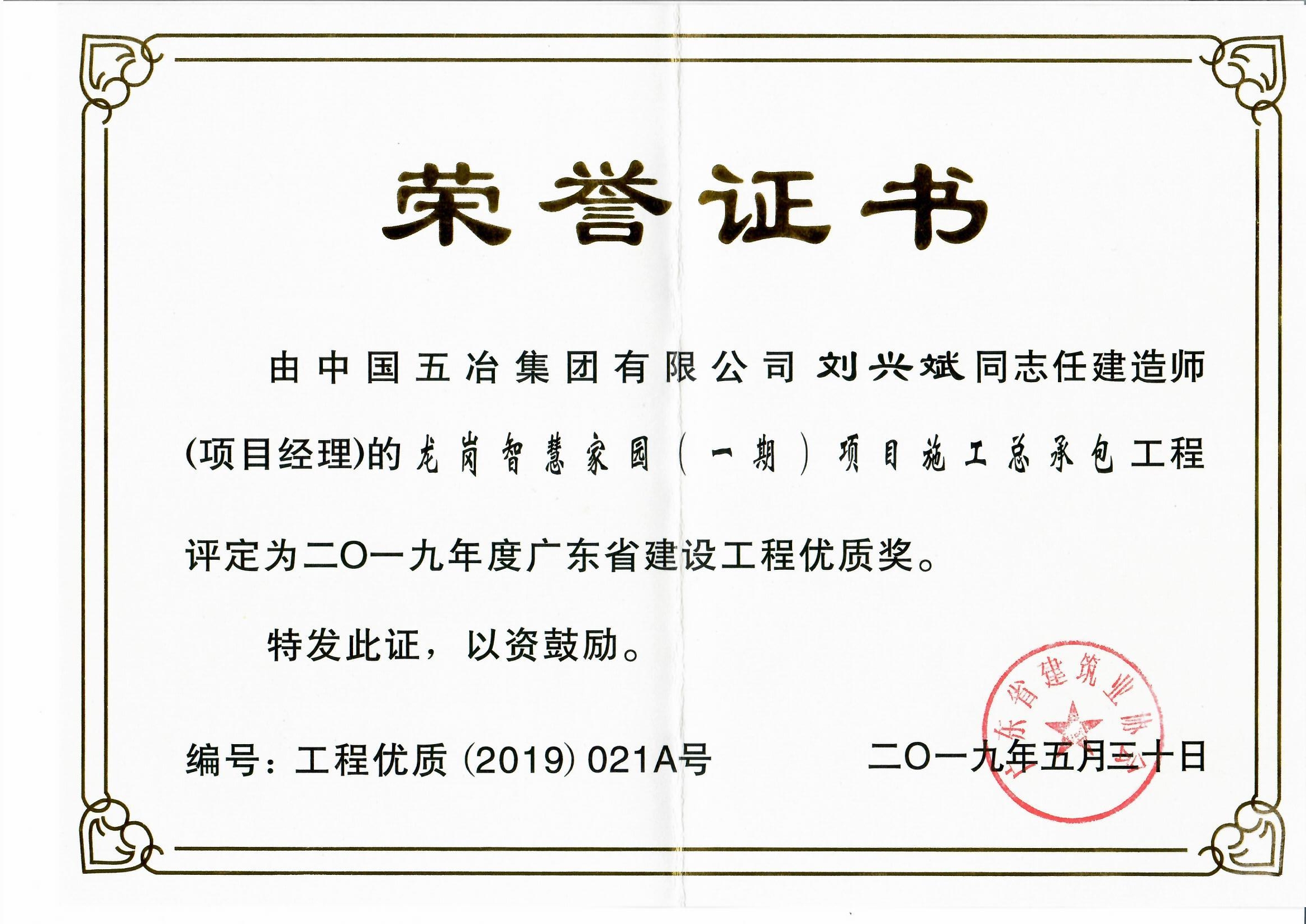 龍崗智慧家園(一期)項目施工總承包榮獲2019年度廣東省建設(shè)工程優(yōu)質(zhì)獎(房屋建筑及專業(yè)工程)