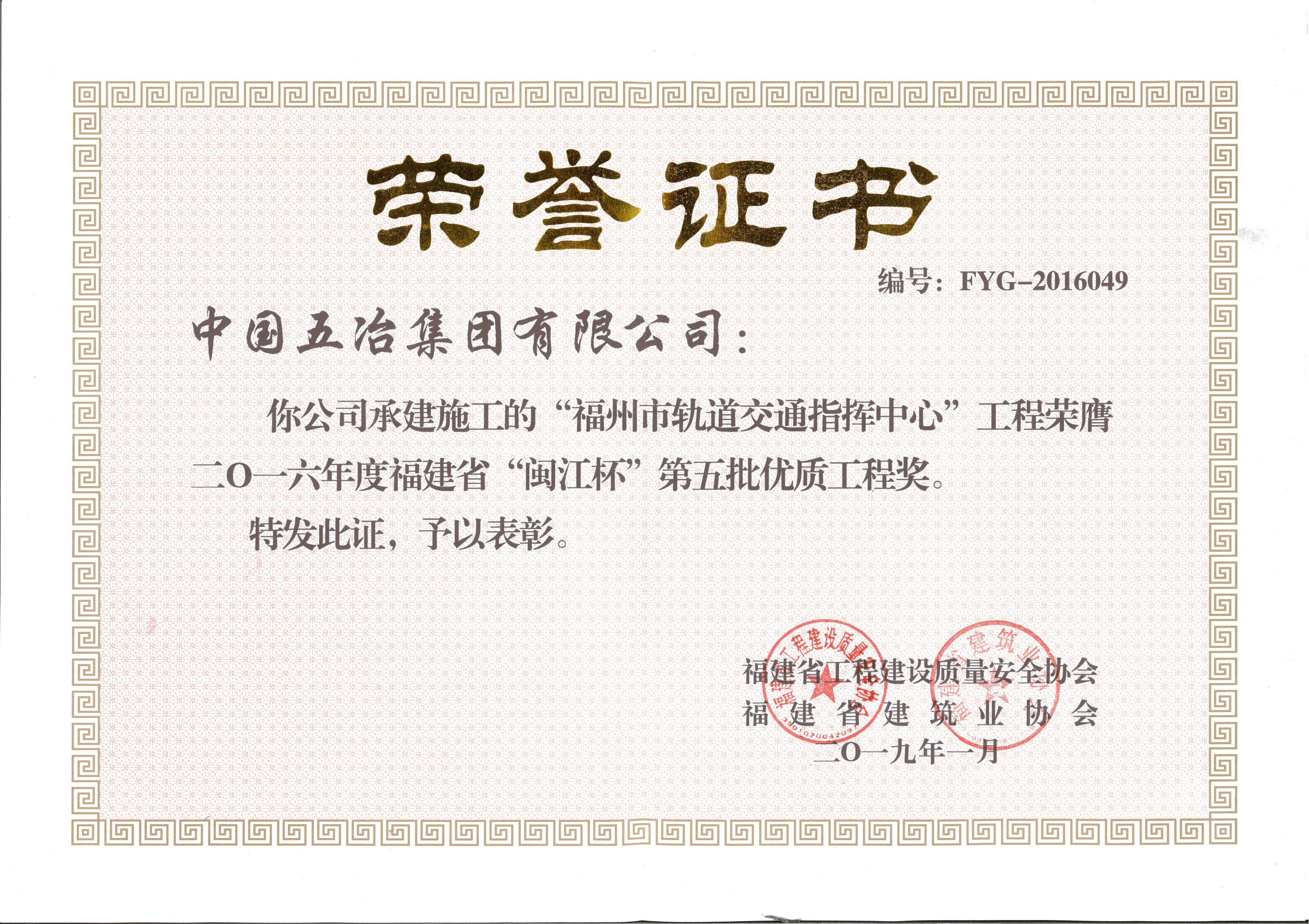 福州市軌道交通指揮中心工程榮膺二0一六年度福建省“閩江杯”第五批優(yōu)質(zhì)工程獎