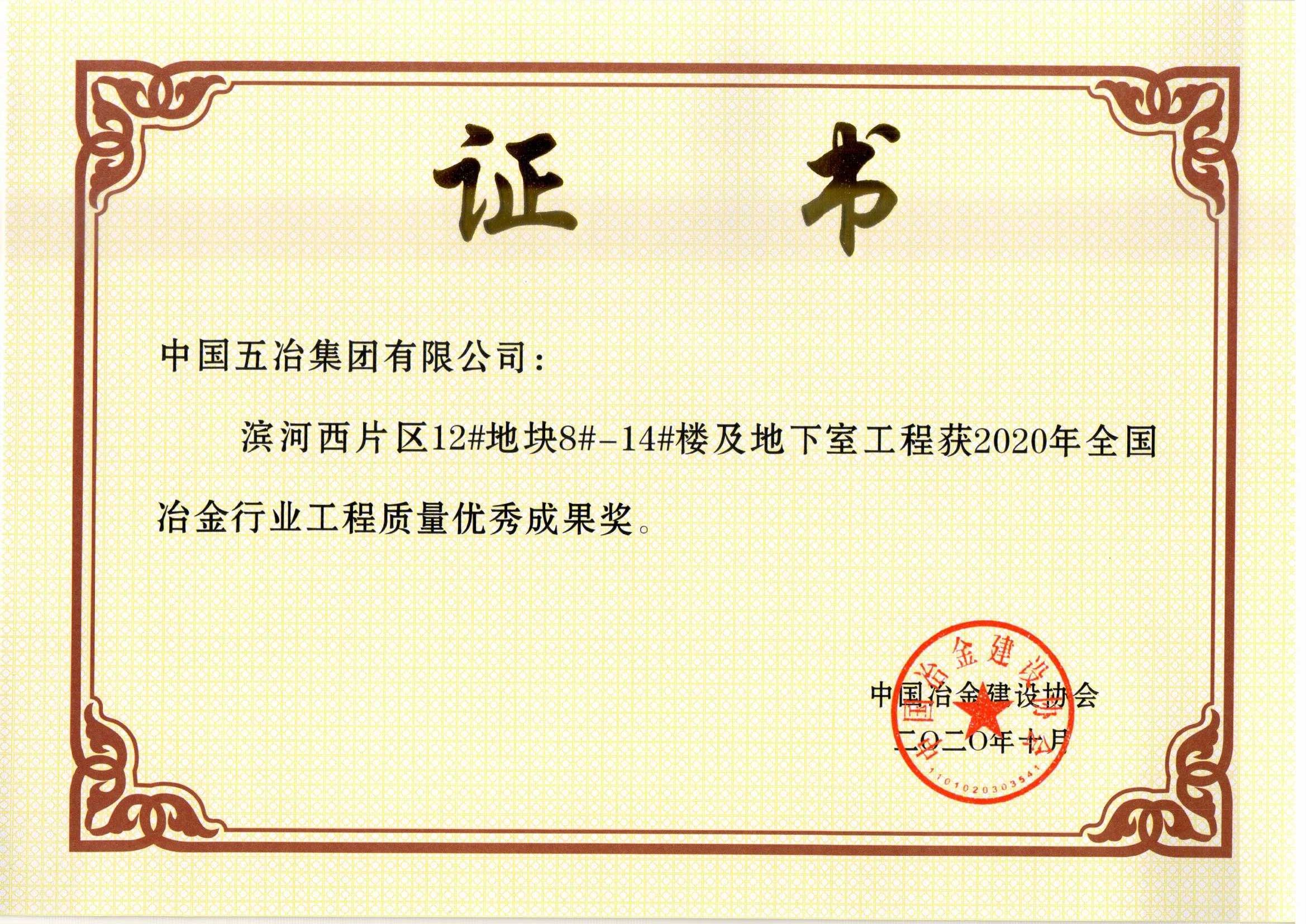 濱河西片區(qū)12#地塊8#-14#樓及地下室工程獲2020年全國冶金行業(yè)工程質(zhì)量優(yōu)秀成果獎