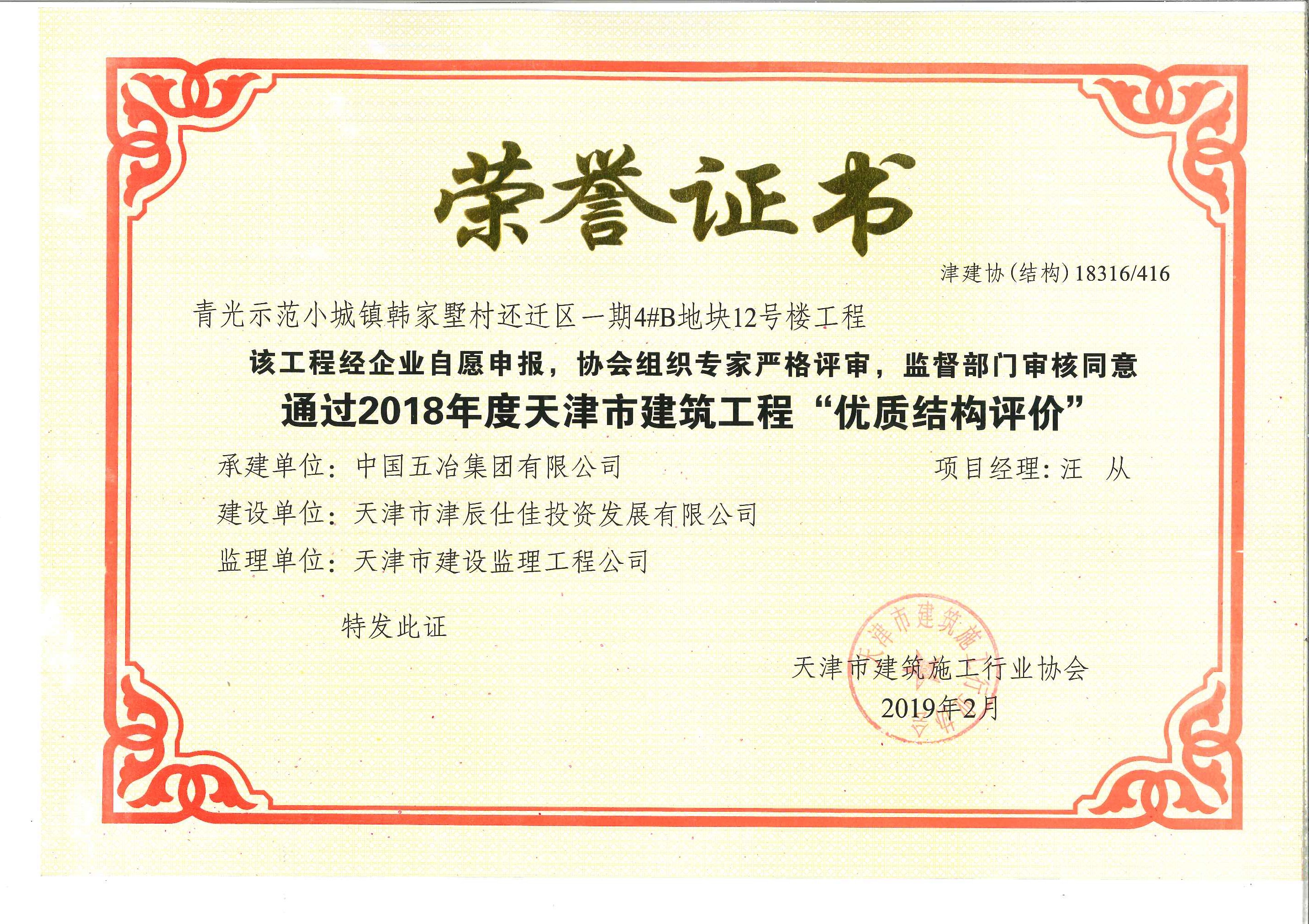 青光示范小城鎮(zhèn)韓家墅村還遷區(qū)-期4#B地塊12號樓工程--2018年度天津市建筑工程“優(yōu)質(zhì)結(jié)構(gòu)評價”
