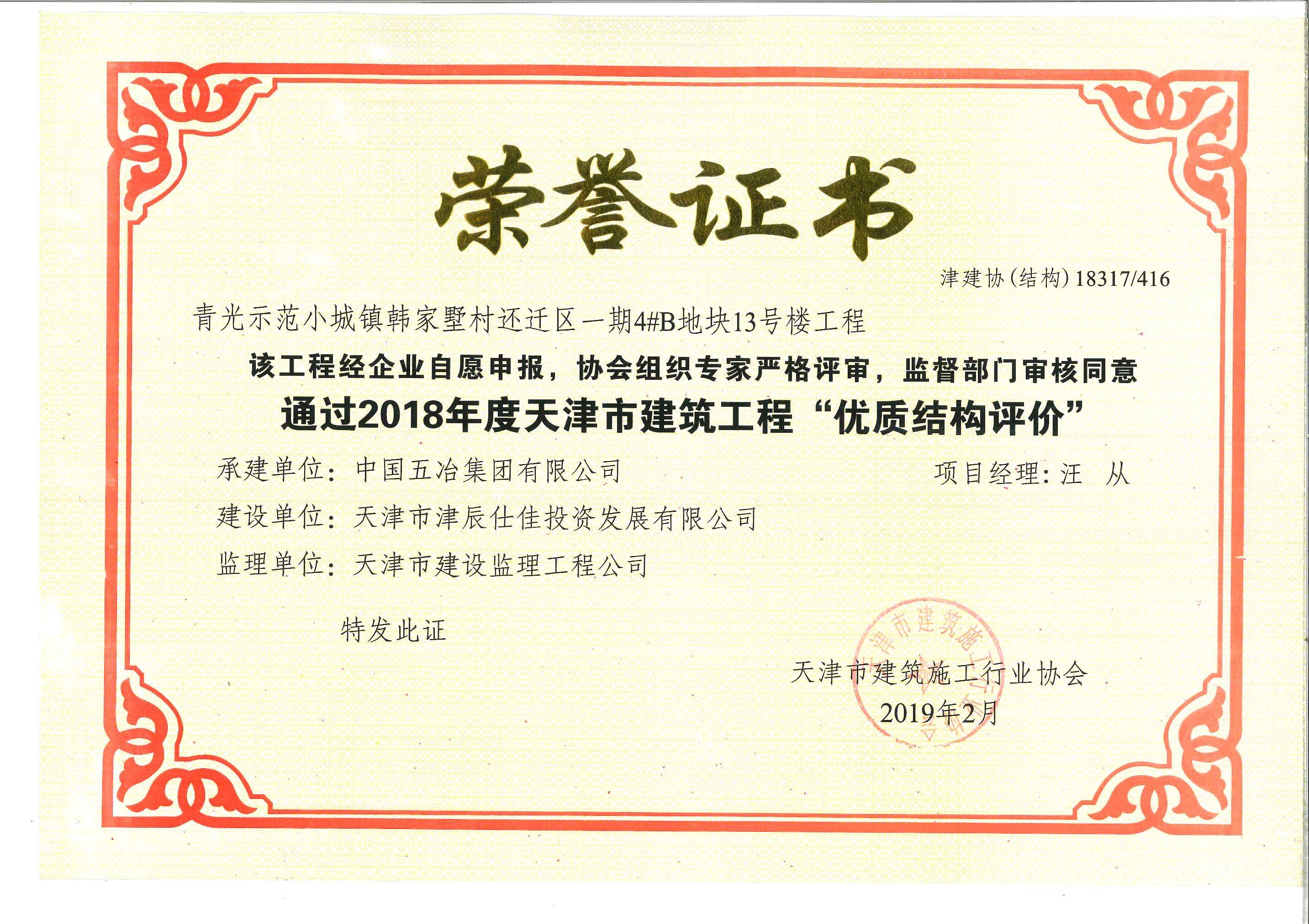 青光示范小城鎮(zhèn)韓家墅村還遷區(qū)-期4#B地塊13號樓工程--2018年度天津市建筑工程“優(yōu)質(zhì)結(jié)構(gòu)評價”
