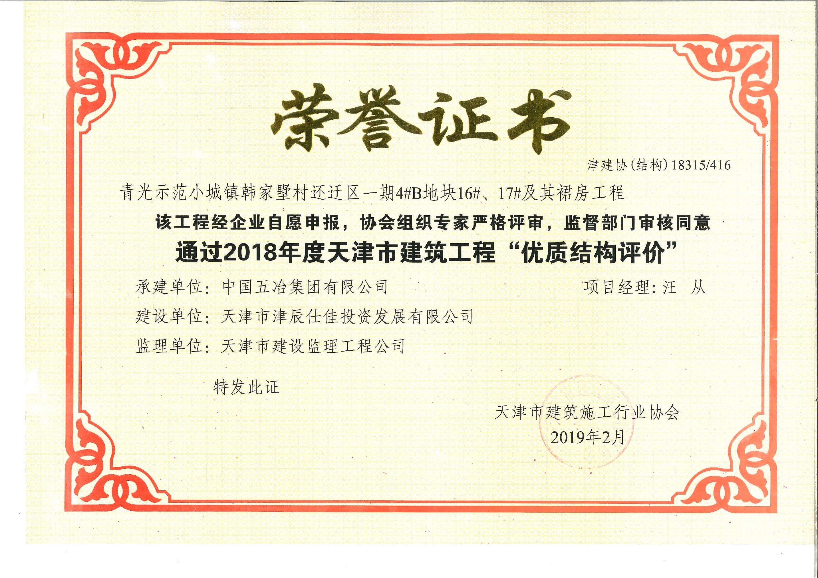青光示范小城鎮(zhèn)韓家墅村還遷區(qū)一期4#B地塊16#、17#及其裙房工程--2018年度天津市建筑工程“優(yōu)質(zhì)結(jié)構(gòu)評價”