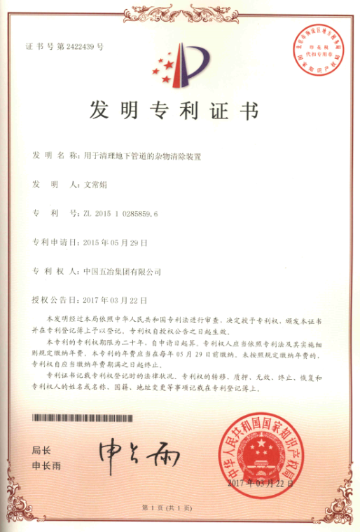 用于清理地下管道的雜物清除裝置 ZL2015102858596