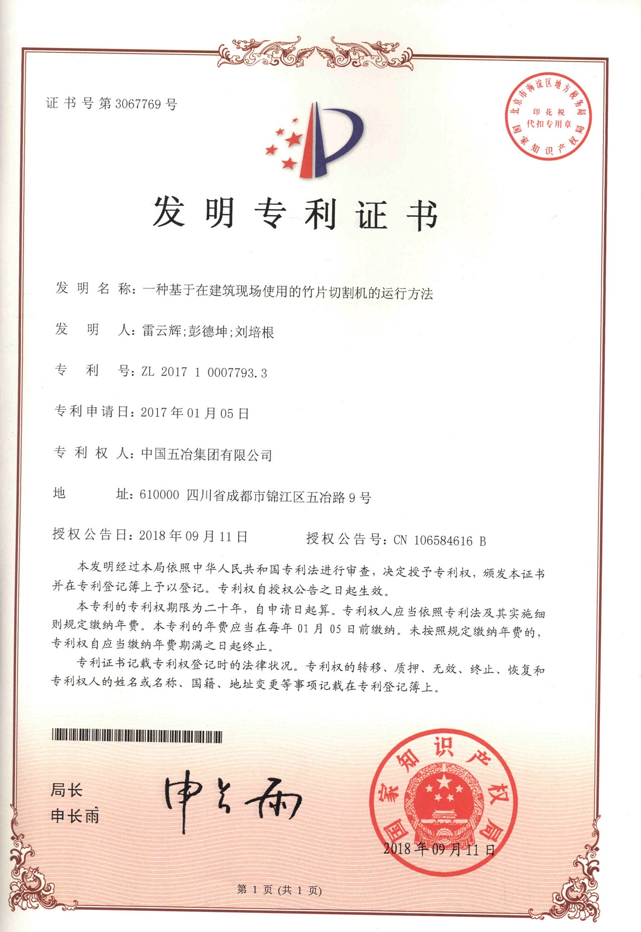 一種基于在建筑現(xiàn)場(chǎng)使用的竹片切割機(jī)的運(yùn)行方法 ZL 201710007793.3