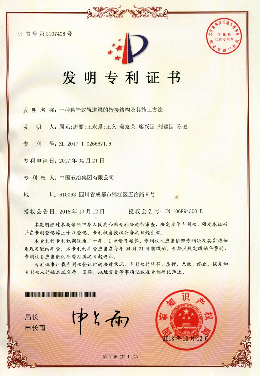 一種懸掛式軌道梁的指接結(jié)構(gòu)及其施工方法 ZL 201710266671.6