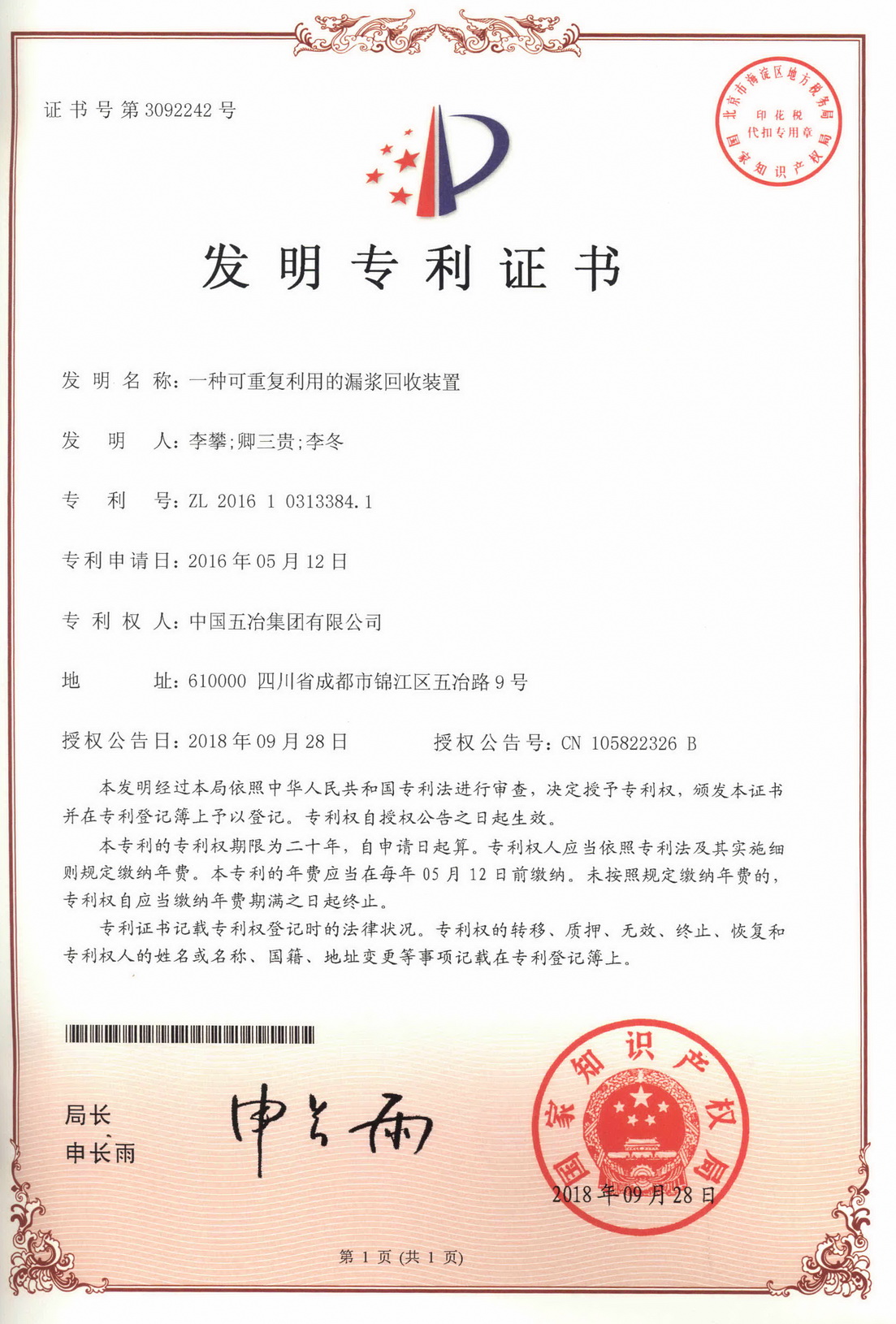 一種可重復(fù)利用的漏漿回收裝置 ZL 201610313384.1