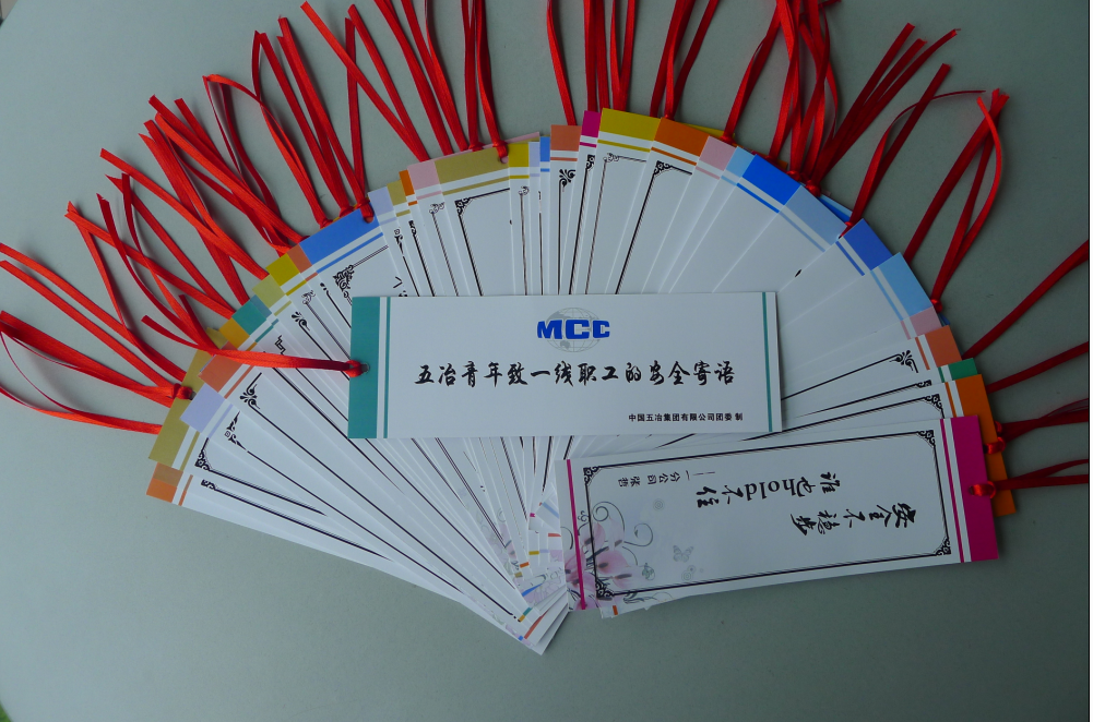 ??????? 8月7日上午,一種設(shè)計獨特新穎、制作精美的書簽式安全寄語卡送到了元華路項目30多位職工的手中。這是公司團委經(jīng)過2個月的廣泛征集和設(shè)計制作,最終形成的“五冶青年致一線職工的安全寄語”書簽卡。從現(xiàn)在起,這些小巧而精美的卡片將陸續(xù)送到公司川滬兩地施工現(xiàn)場。