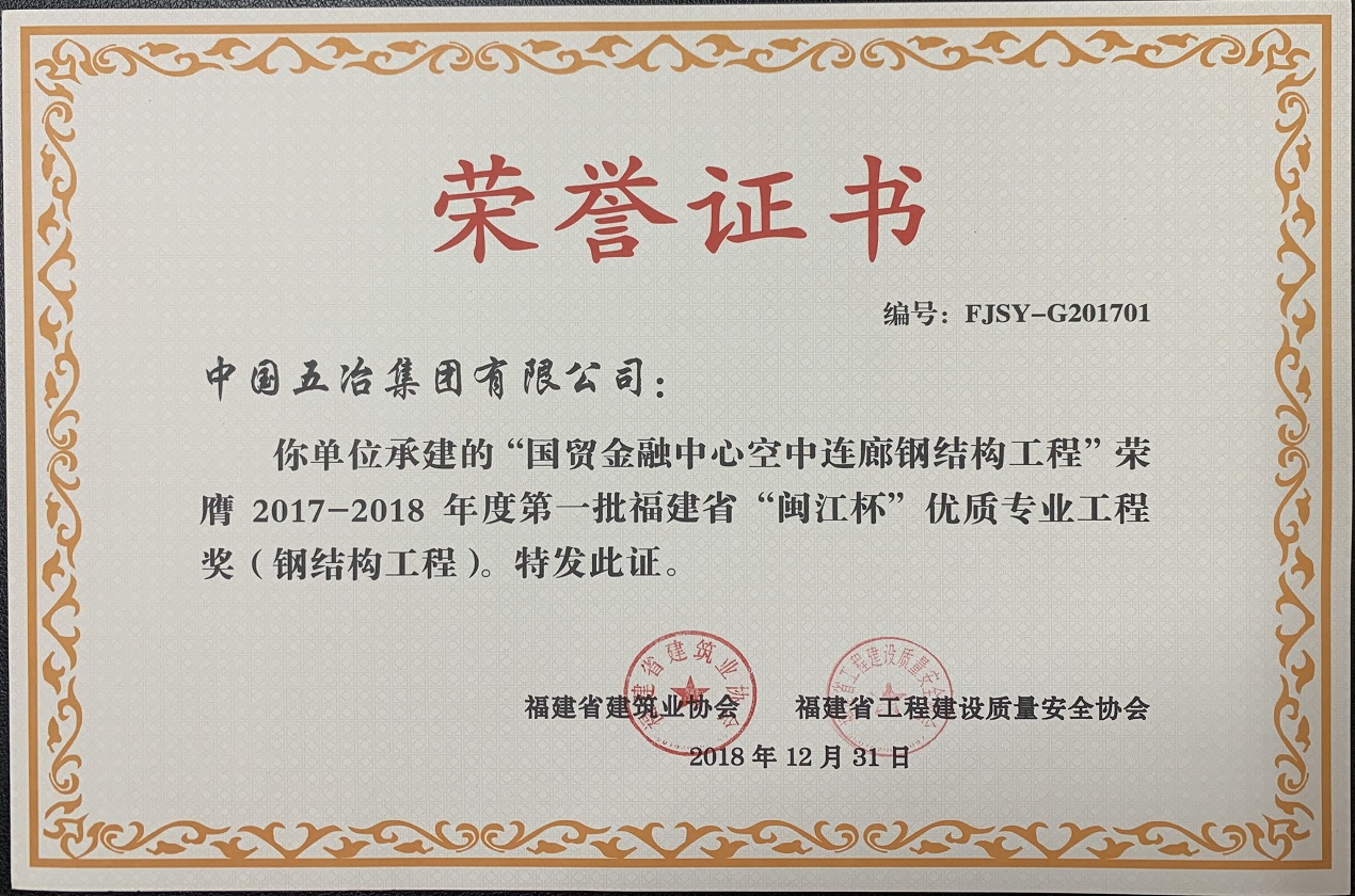 “國貿(mào)金融中心空中連廊鋼結(jié)構(gòu)工程”榮獲2017—2018年度第一批福建省“閩江杯”優(yōu)質(zhì)專業(yè)工程獎(鋼結(jié)構(gòu)工程)