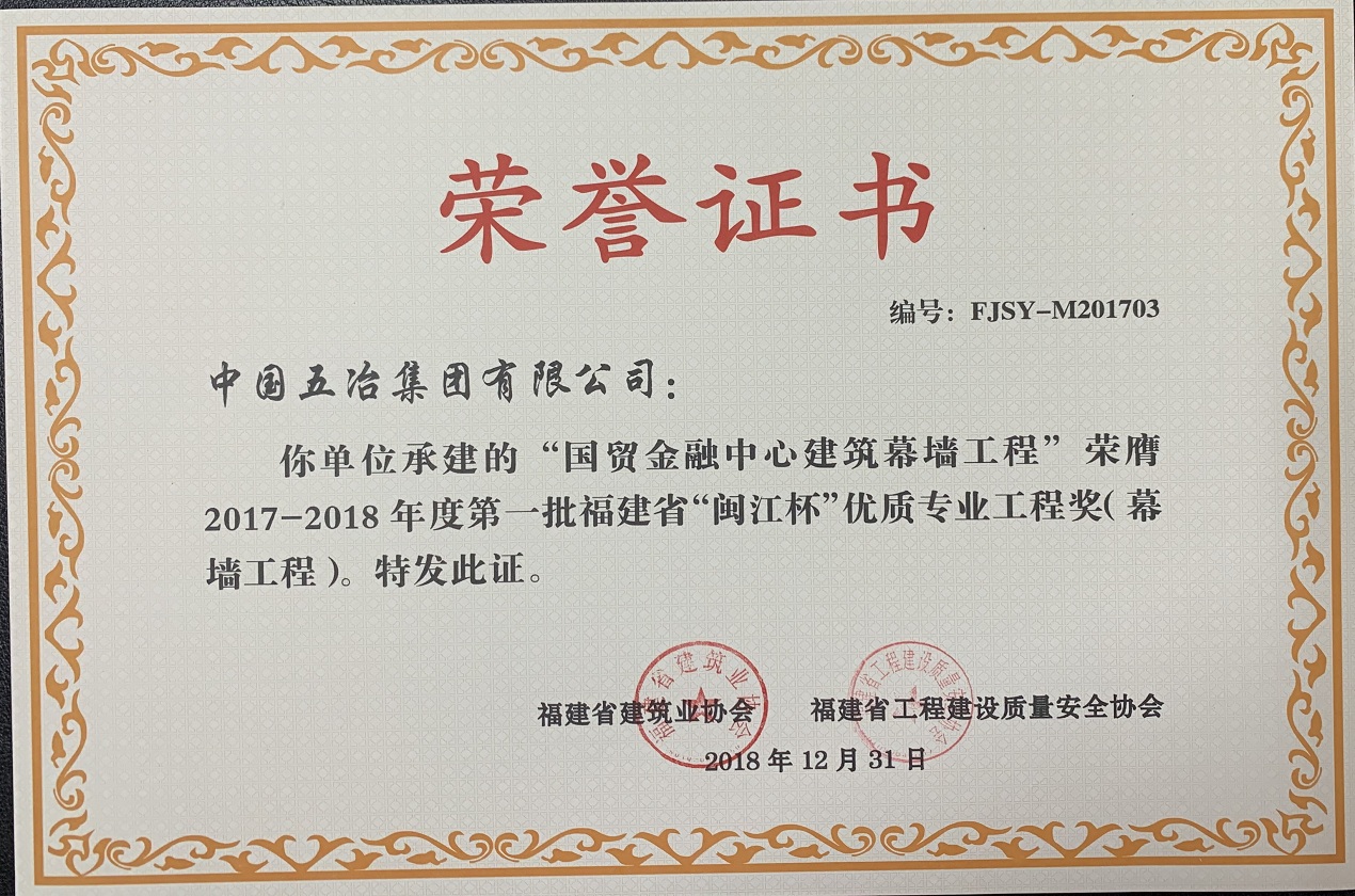 國(guó)貿(mào)金融中心建筑幕墻工程榮獲2017—2018年度第一批福建省“閩江杯”優(yōu)質(zhì)專(zhuān)業(yè)工程獎(jiǎng)(幕墻工程)