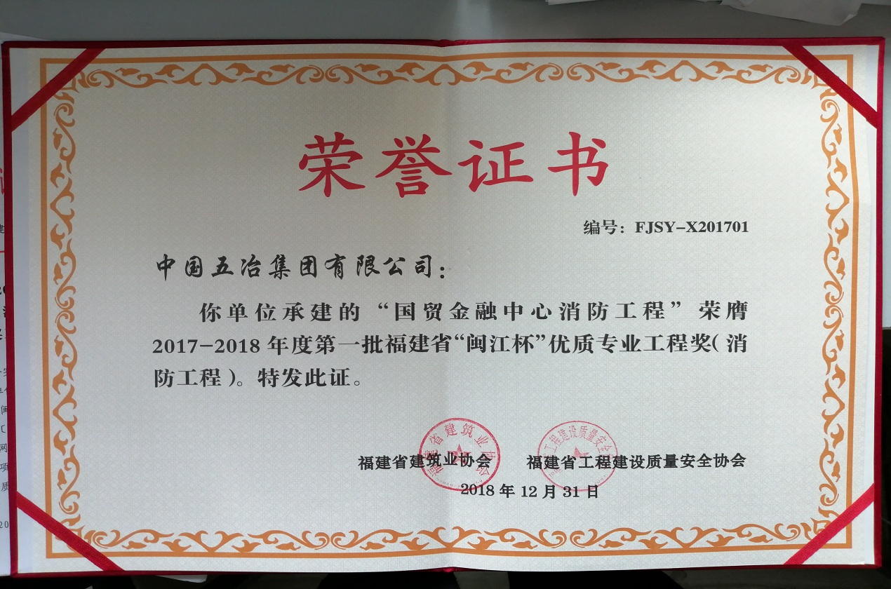 國貿(mào)金融中心消防工程榮獲2017—2018年度第一批福建省“閩江杯”優(yōu)質(zhì)專業(yè)工程獎(消防工程)