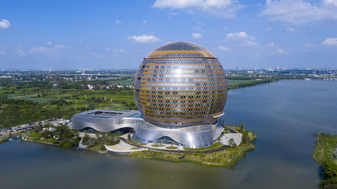 湖州太陽酒店項(xiàng)目位于浙江湖州南潯區(qū),是主體直徑97.2米的世界最大球體建筑,也是集住宿、餐飲、娛樂、旅游等多功能于一體的五星級綜合性酒店。項(xiàng)目通過深度應(yīng)用建筑信息技術(shù),建立了覆蓋各個專業(yè)和建設(shè)全周期的“全科醫(yī)生檔案”,不僅為施工質(zhì)量及安全保駕護(hù)航,同時,針對球體鋼結(jié)構(gòu)、單層穹頂網(wǎng)殼提升、弧形管道深化及預(yù)制等方面難題重點(diǎn)突破,讓太陽得以驚艷“閃耀”,成為湖州的城市地標(biāo)和熱門網(wǎng)紅打卡點(diǎn)。