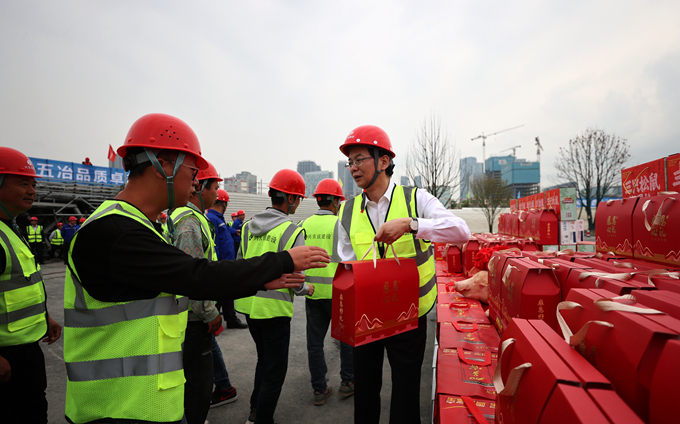 朱永繁董事長(zhǎng)一行先后來(lái)到成都創(chuàng)智科技產(chǎn)業(yè)園區(qū)、交子公園東區(qū)A地塊項(xiàng)目現(xiàn)場(chǎng),仔細(xì)檢查安全生產(chǎn)工作落實(shí)和執(zhí)行是否到位,詳細(xì)了解項(xiàng)目策劃、工期、技術(shù)、質(zhì)量、經(jīng)營(yíng)等方面管理情況,并向一線員工送上豬肉、堅(jiān)果、牛奶、涼茶、水果、餅干、方便面、礦泉水等慰問(wèn)品。