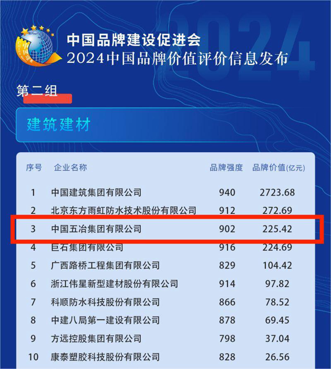 5月11日,第八個中國品牌日系列活動期間,中國品牌建設(shè)促進(jìn)會聯(lián)合新華社、中國資產(chǎn)評估協(xié)會等單位聯(lián)合發(fā)布“2024中國品牌價(jià)值評價(jià)信息”,經(jīng)權(quán)威評估,中國五冶集團(tuán)品牌價(jià)值達(dá)到225億元,位列全國建筑建材領(lǐng)域參評企業(yè)前三,同類同級企業(yè)第一。