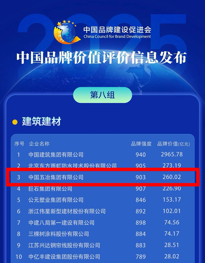 5月10日,第九個中國品牌日系列活動期間,中國品牌建設(shè)促進(jìn)會聯(lián)合新華社、中國資產(chǎn)評估協(xié)會等單位聯(lián)合發(fā)布“2025中國品牌價值評價信息”,經(jīng)權(quán)威評估,中國五冶集團(tuán)品牌價值達(dá)到260.02億元,較去年增長15.3%,位列全國建筑建材領(lǐng)域參評企業(yè)前茅。